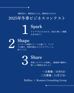 冬季高校生ビジネスコンテストは、MiRyze と Komuro Consulting(コムロコンサルティンググループ)が共催する、高校生による高校生のためのビジネス舞台です。多様なバックグラウンドを持つ高校生が国境や言語を越えて集い、現場に近い実践で“考える力”と“やり抜く力”を磨きます。MiRyze は帰国子女や国際経験者が中心の組織であるため、日本語・英語・中国語・フランス語などどんな言語でも対応可能。言葉の壁を越えて、あなたのアイデアを世界に伝える機会を用意します。